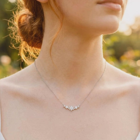 This delicate necklace combines timeless elegance with subtle, brilliant sparkle. Crafted from genuine 925 sterling silver, the fine bar pendant features high-quality simulated diamond 5A cubic zirconia crystals in marquise and brilliant cut, arranged in a delicate flower-inspired design for refined shine and light-catching brilliance.