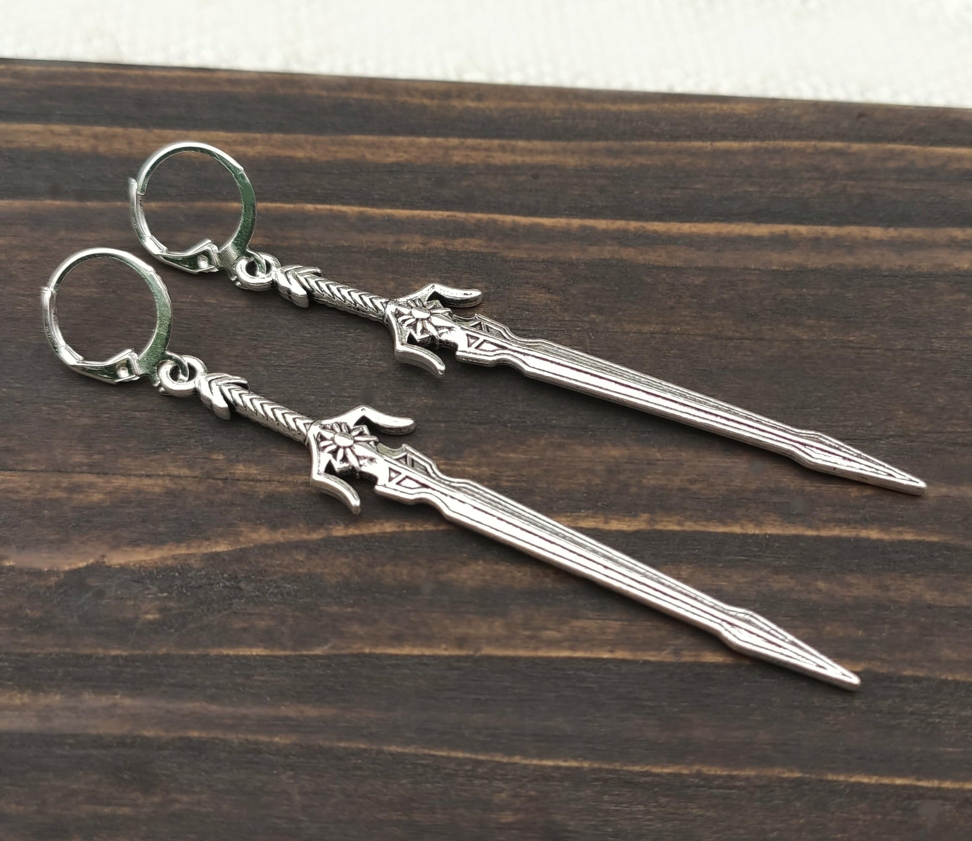 7cm Silver sword earrings with hoops, Handmade fantasy jewelry, Cool gift idea